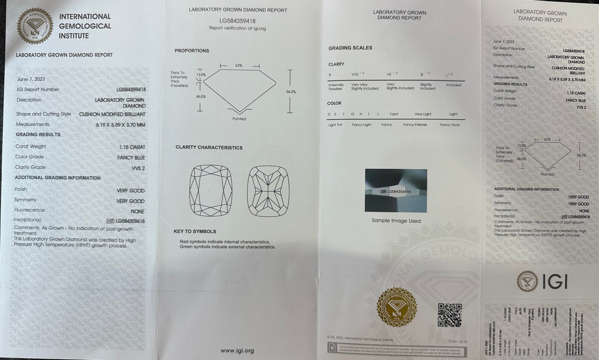 HPHT Lab Grown Blue Color Diamonds Cushion Shape 0.5ct~5.0ct VVS/VS With IGI Certificate