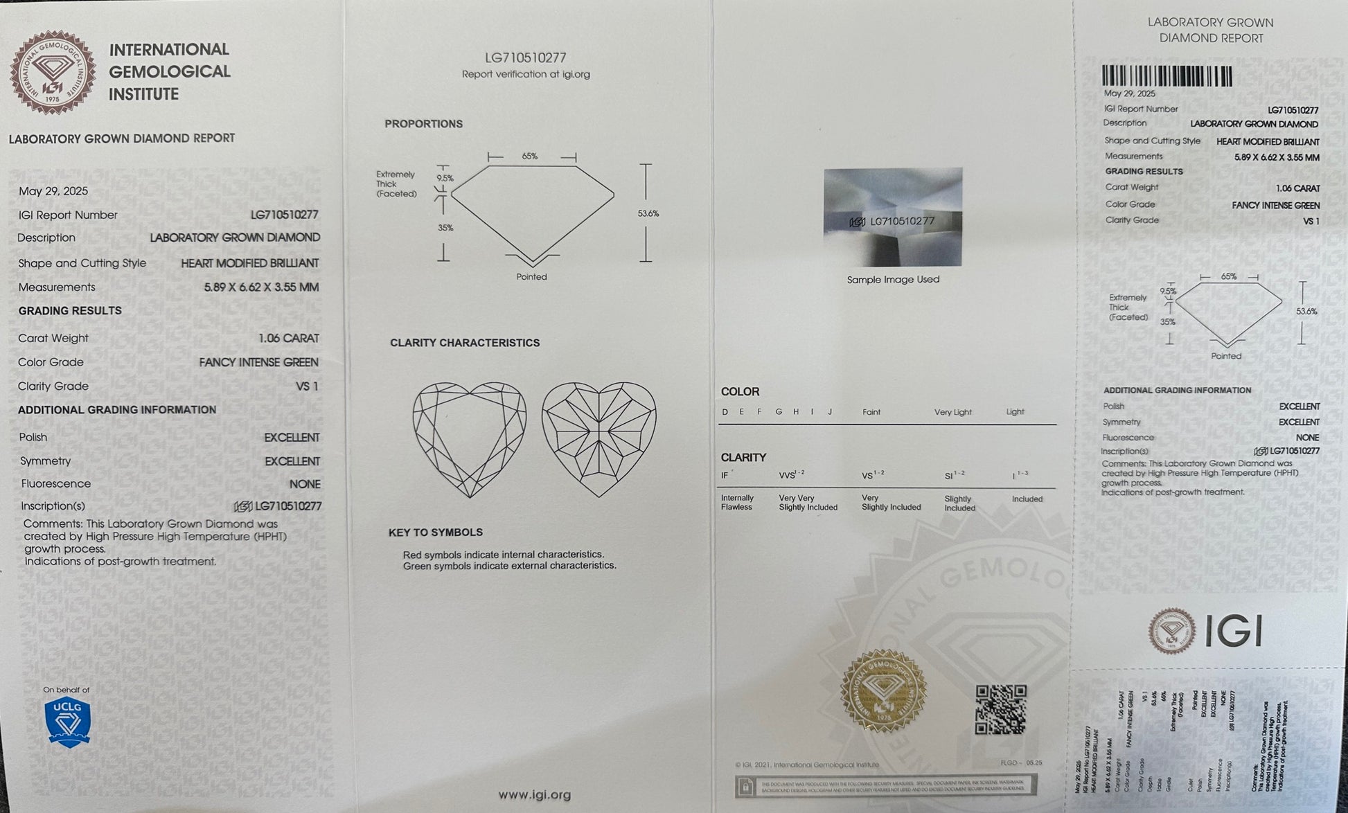 HPHT Lab Grown Green Color Diamonds Heart Shape 0.5ct~5.0ct VVS/VS With IGI Certificate