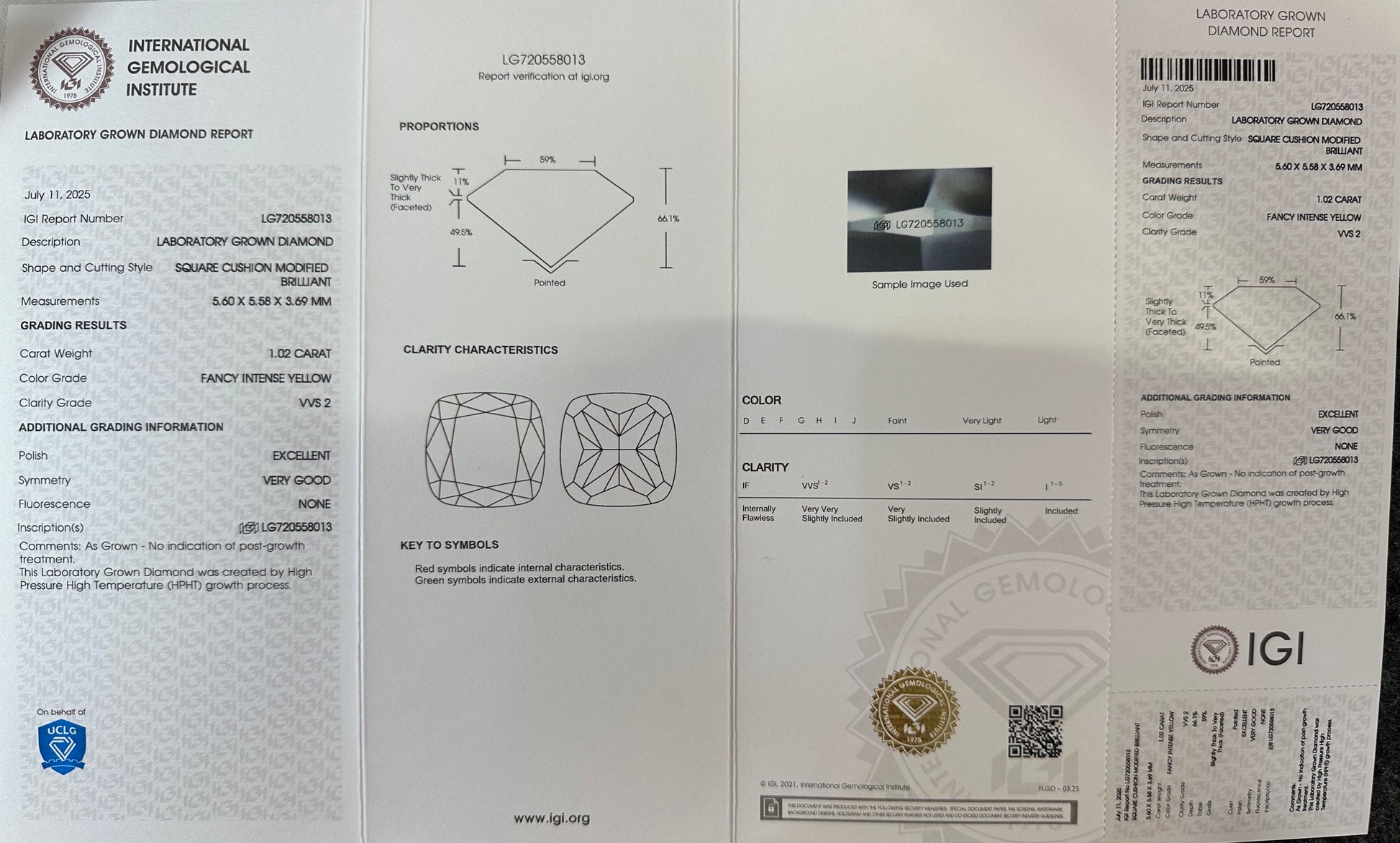 HPHT Lab Grown Yellow Color Diamonds Cushion Shape 0.5ct~5.0ct VVS/VS With IGI Certificate